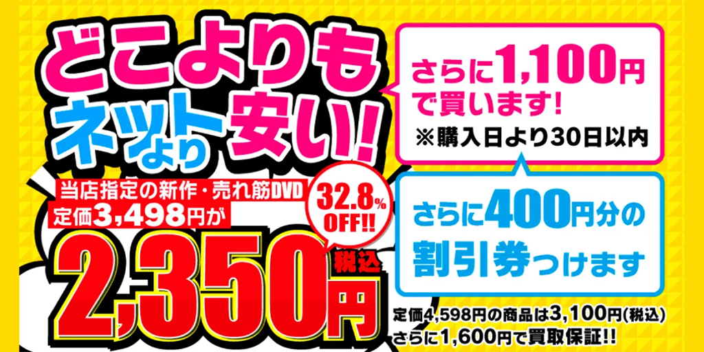 最新作も定価の20%・30%OFFは当たり前!地域一番の激安価格で販売! 最新メーカーおすすめタイトルを、どこよりも、ネットよりも安く販売!(実施していない店舗もございます) 日本一スケベなバイヤーがアダルトを研究して20年以上、毎日見て性癖ごとにすごく抜ける商品を特設コーナーでおすすめしています。