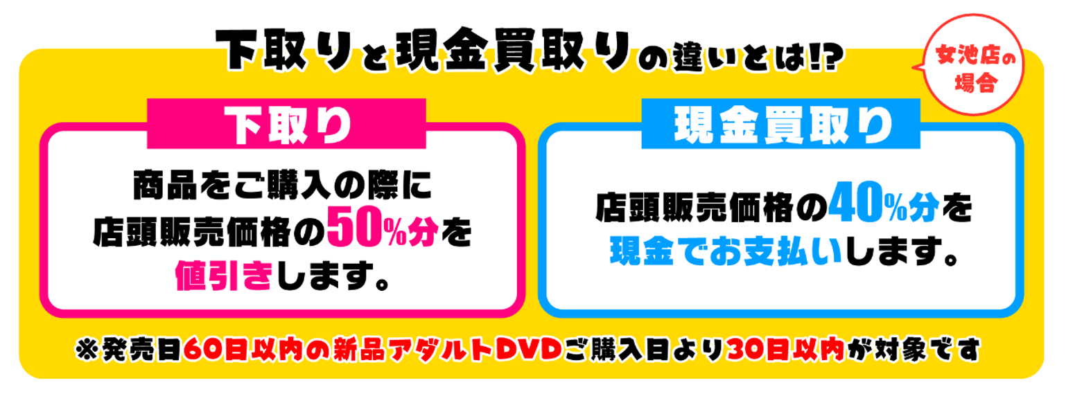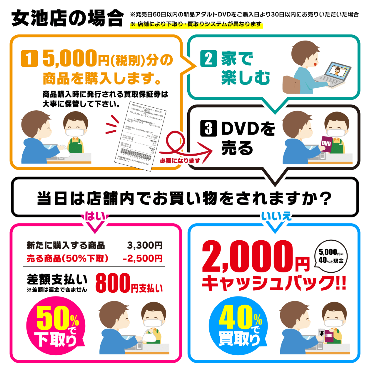 当店でご購入いただいた発売日より60日以内の新品アダルトDVDを、ご購入日より30日以内にお売りいただくと、当店の販売価格の40%で現金買取り、または50%で下取りさせていただきます。